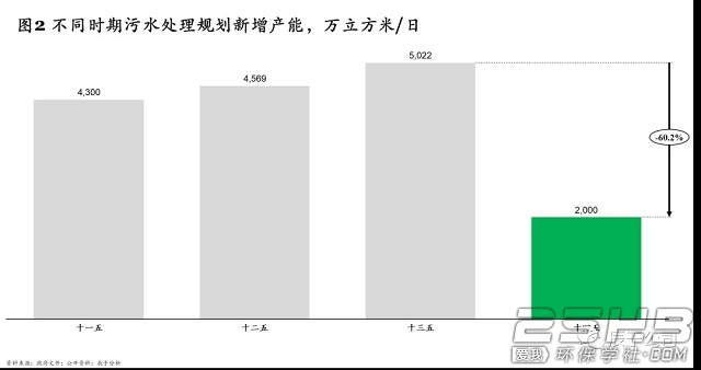 一是如前文所述,污水处理设施建设已经进入补短板、强弱项阶段,“十四五”规划中污水处理设施与管网建设目标与“十三五”相比,分别减少了60%和48%,投资空间大幅度下降。