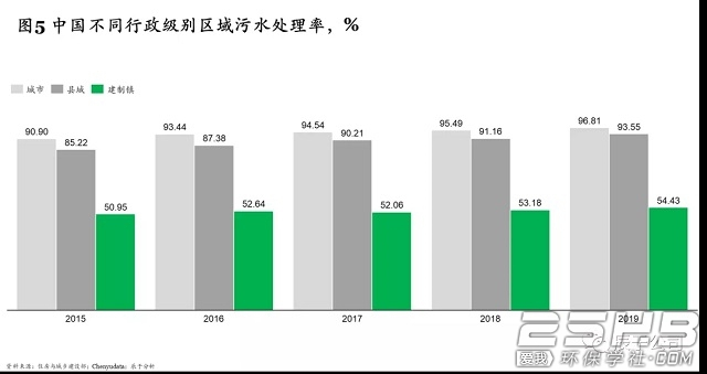 与城市污水处理市场接近饱和不同,建制镇污水处理市场仍存在较大需求:截至2019年底,建制镇污水处理率仅为54.43%,与“十三五”规划提出的目标70%差距较大(见图5),仍有接近40%的建制镇没有对生活污水进行处理。