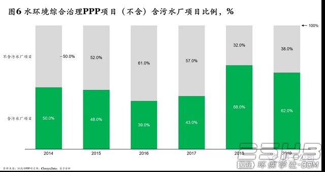此外,我们也看到,越来越多的单一污水项目逐渐融入到水环境综合治理及长江、黄河的流域保护治理中,尤其是2017年PPP清库开始后,含有污水厂建设运营的水环境综合治理项目占比明显增加,相比2017年之前的不到50%,2018、2019连续两年这一比重都超过60%(见图6)。