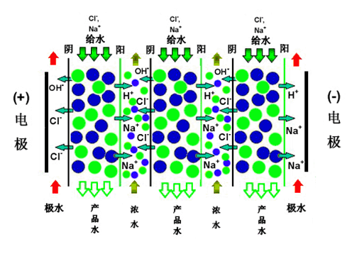 造技术。它巧妙的将电渗析和离子交换技术相结合,利用两端电极高压使水中带电离子移动,并配合离子
