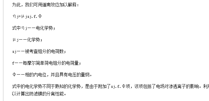 式中的电化学势不同于熟知的化学势,是由于附加了zj.f.φ项,该项包括了电场对渗透离子的影响。利用此式,可以推导出体系中的离子分布,以计算出纳滤膜的分离性能。