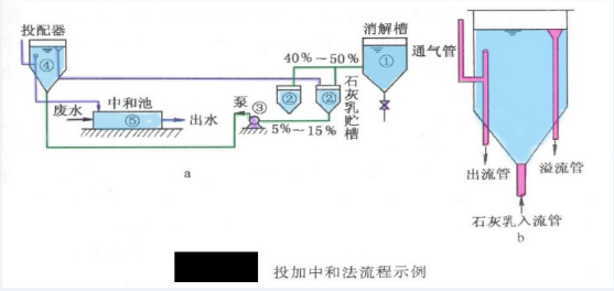 药剂中和在混合池中进行,其后需设沉淀池和污泥干化。药剂中和的工艺过程过程包括:药剂的制备与投加——混合与反应——中和产物分离——泥渣的处理和利用。