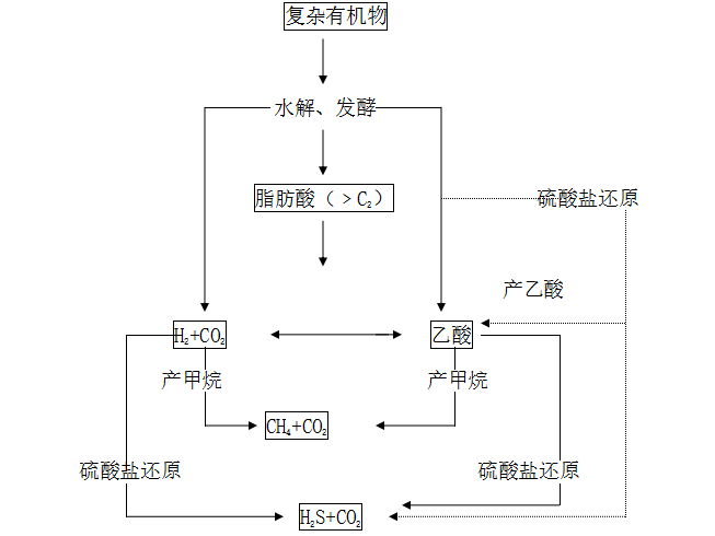 d、 产甲烷阶段——包括从乙酸形成甲烷,以及从氧、二氧化碳形成甲烷。废水中有硫酸盐时,还会有硫酸盐还原过程,如虚线所示。