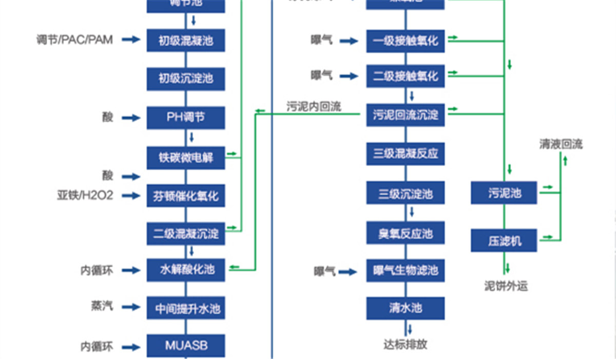 本项目污水处理系统设计采用工艺为:综合废水+混凝沉淀+铁碳微电解+芬顿催化氧化+二级混凝沉淀+水解酸化+中间水池+MUASB+兼氧池+一级接触氧化池+二级接触氧化池+沉淀池1+混凝沉淀池+臭氧反应池+曝气生物滤池+排放水池